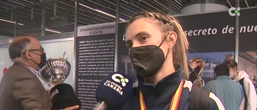 La capitana del CV CCO 7 Palmas, Saray Manzaro, mejor jugadora del torneo, con el trofeo en sus manos, hizo aparición en la zona de llegada junto al resto de equipo. Manzano señaló que si hay una palabra que pueda resumir las sensaciones que ahora mismo viven las jugadoras es “emocionadas”. La jugadora destacó la temporada realizada por el equipo culminada con este título.