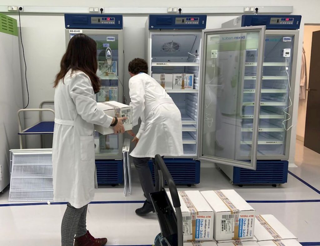 Dos técnicos meten en cámaras frigoríficas las vacunas de AstraZeneca distribuidas por el Ministerio de Sanidad